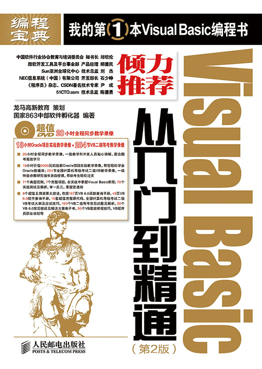 本书主要面向Visual Basic初学者和爱好者,旨在帮助读者掌握Visual Basic基础知识、了解开发技巧并积累一定的项目实战经验。当读者系统地学习完本书内容之后,就可以骄傲地宣布——“我是一名真正的Visual Basic程序员了!”。