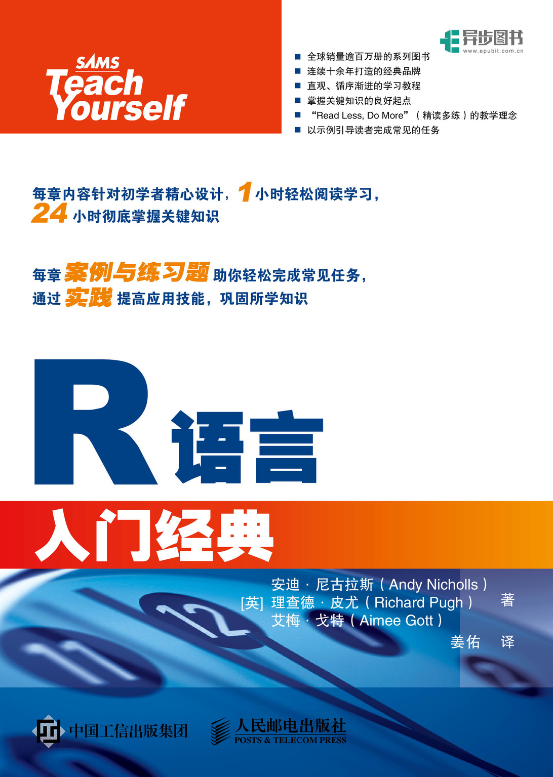 本书从R语言的基础知识开始,由浅入深地详细介绍了到数据科学中的常见任务,包括数据操控、数据可视化和数据建模。结合R语言的特性,介绍了如何编写出高质量、可读性好的产品级代码。作为培训教程,本书有大量简单易懂的示例,所有示例可在本书的网站(http://www.mangosolutions.com/wp/teach-yourself-r-in-24-hours-book)中下载。我们在本书中一直强调要养成良好的编程习惯,结合我们用R开发产品的经验,将给读者提供一些实用的编程技巧。