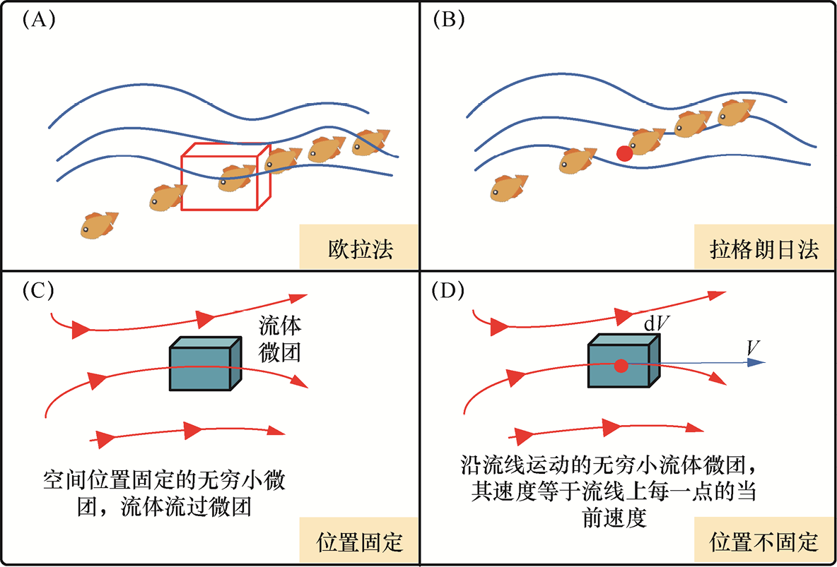 综上:欧拉法是固定微团来观察微团内流体微元的变化,参见图1-4(C);而拉格朗日法是站在流体微团的角度来观察流体的变化,参见图1-4(D)。