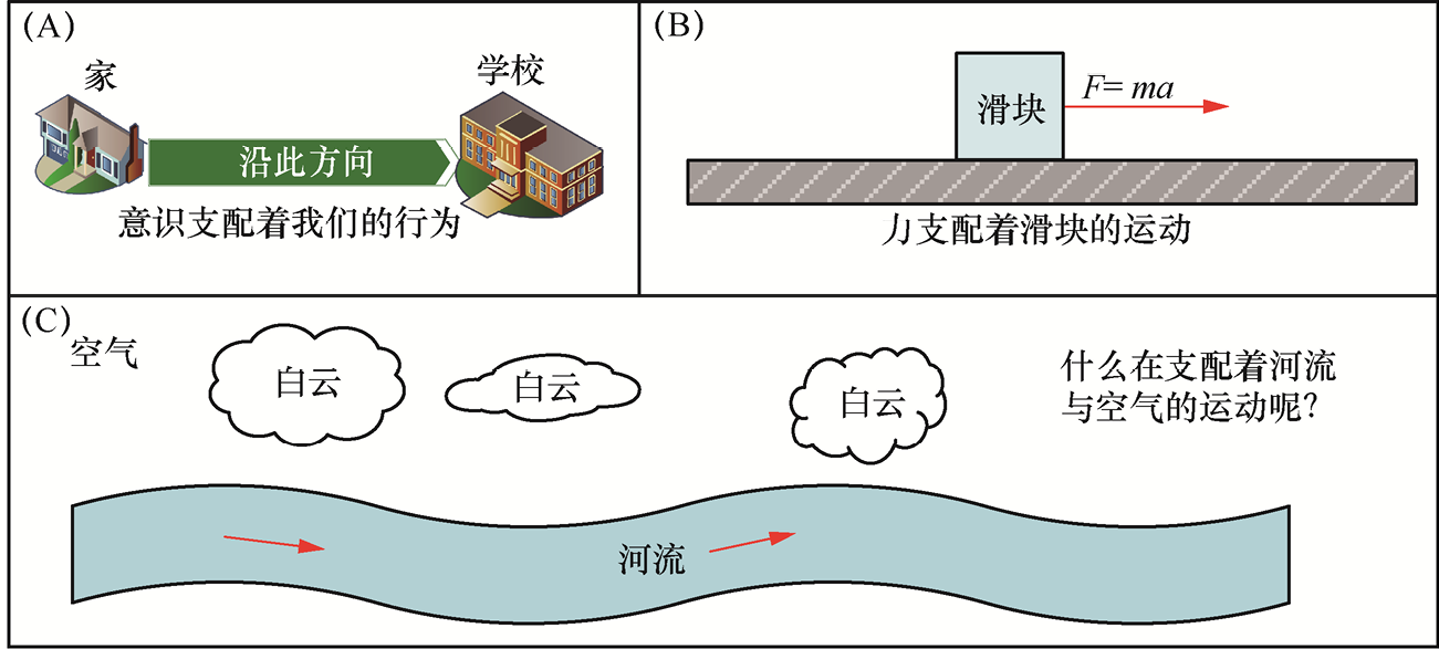 我们每天的行为会受意识支配,比如上小学时,早上我们从家去学校,当面对走哪条路更近的问题时,意识会帮助我们判断并做出决定[见图1-1(A)]。中学时代学习牛顿第二定律时,当质量为m的小滑块受到力F的作用时,我们就可以算出它的加速度