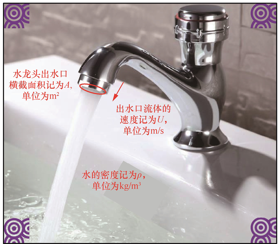 当我们研究流体时,更关注流体运动的过程,就要在质量概念的基础上再往前推进一步。我们用质量流量来描述流体单位时间流进/流出某截面的质量。如图1-2所示,早上我们打开水龙头洗漱,水龙头出水口的横截面积记为A,单位为m2;出水口流体的速度记为U,单位为m/s;水的密度记为ρ,单位为kg/m3。为了方便计算,我们取A=0.001m2,U=3m/s,ρ=1000kg/m3。如果水龙头打开的时间段Δt等于2s,那么在这2s内,我们一共接了多少水呢?也就是水池中积了多少千克的水呢?这个问题用初中物理知识就可以解决。