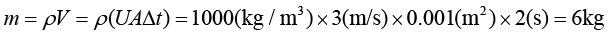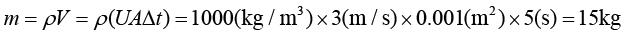 从上式可以看出,在密度ρ已知的情况下,要想求质量m,关键是求出在时间段Δt=2s内从水龙头流出的水的体积V。水从水龙头出来形成一个水柱(假设水流不被打断,且假设水流截面积保持不变),我们知道对于柱体而言,体积等于底面积乘以高。底面积就是水龙头的出水的横截面积A,高应该为多少呢?水的速度为U,时间段为Δt,那么在Δt内,水流过的距离就是高,应该等于UΔt。于是可得水柱的体积为