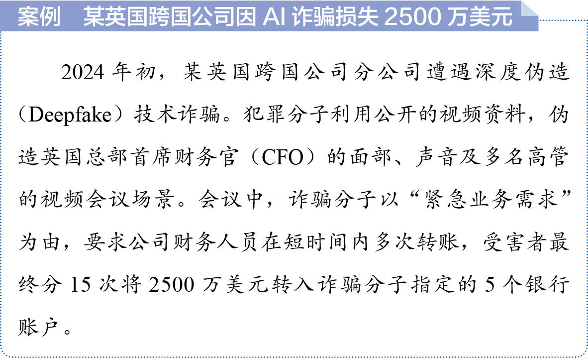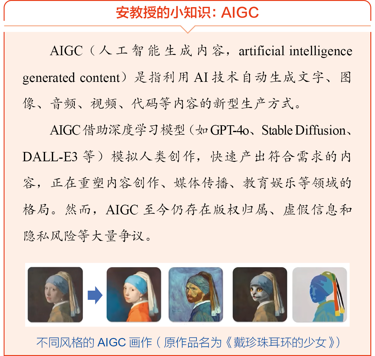 小翼想起之前搜索的新闻,说:“AIGC可能生成虚假的内容(如假新闻、假论文),甚至还能通过AI换脸冒充别人进行诈骗。”说罢,小翼就给小白生动地讲述了某金融机构被AI换脸诈骗2500万美元的案例,引得小白连连惊叹:“AIGC技术是挺先进的,但是一旦被滥用,危害也很大!”