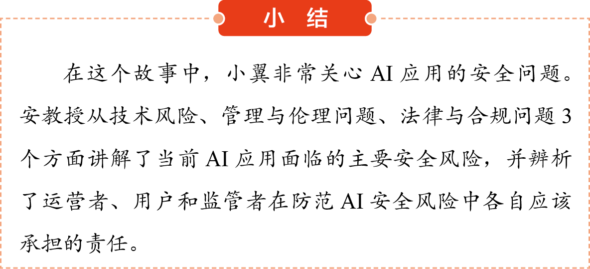 见小白点头,小翼接着说:“听完他第一堂课,我有好多疑问,今天上午找他聊了聊,他给我讲了很多有关AI安全风险的知识呢!”