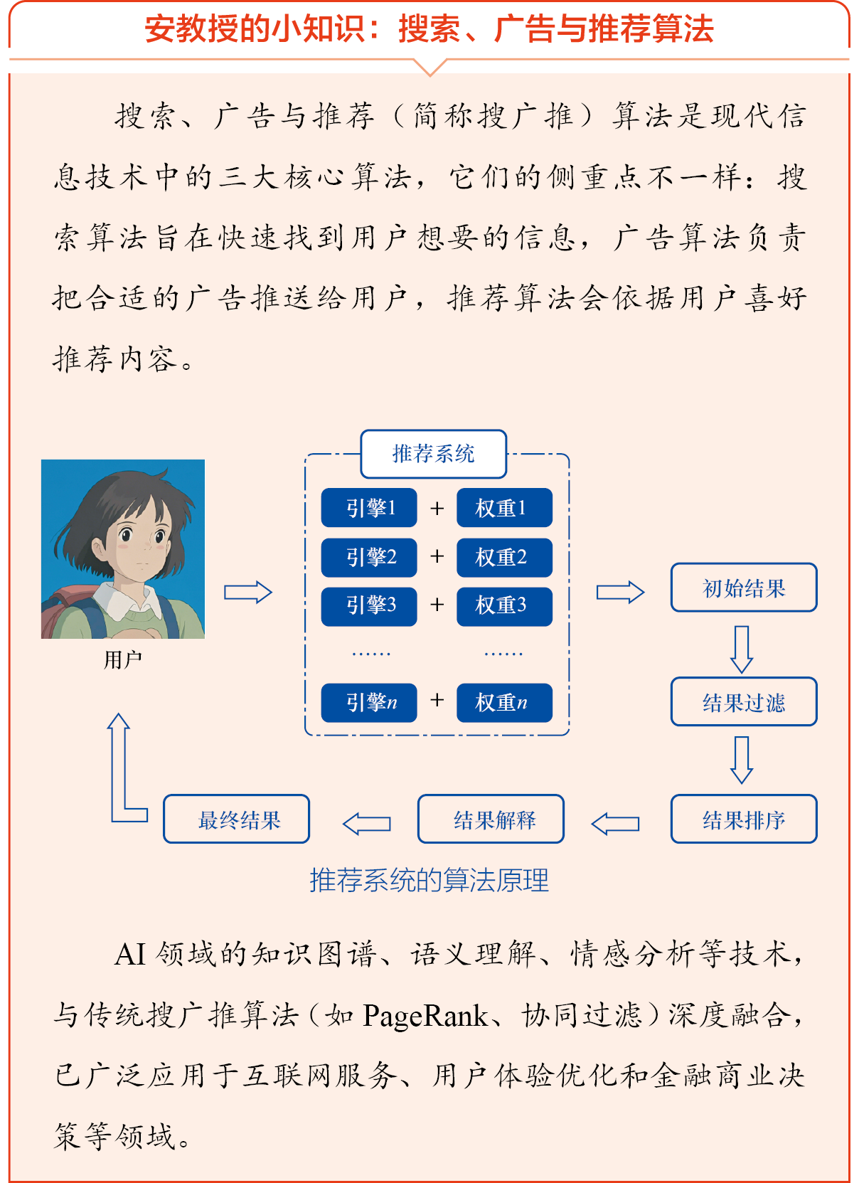 小翼说:“还有一类非常普及的AI应用叫作搜索、广告与推荐算法。大家平时使用购物软件搜索商品,或者在社交软件上刷小视频时,常常会看到首页有一个‘猜你喜欢’的推送栏目,这些推荐的内容就有AI的深度参与。”