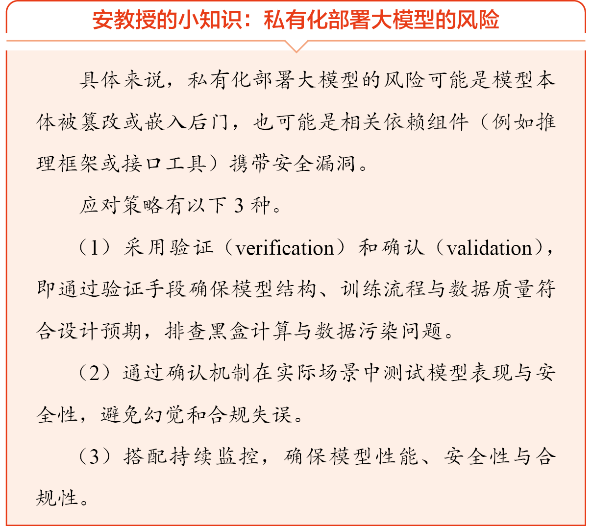 “咳咳,”安教授扶了扶眼镜,故意拖长声音停顿片刻,才继续说道,“在模型部署阶段,需要注意的是,目前越来越多的企业开始私有化部署大模型,但模型本身和第三方的推理框架都可能存在安全隐患。就像你请了好医生,但翻译出了错,诊断也就错了。”
