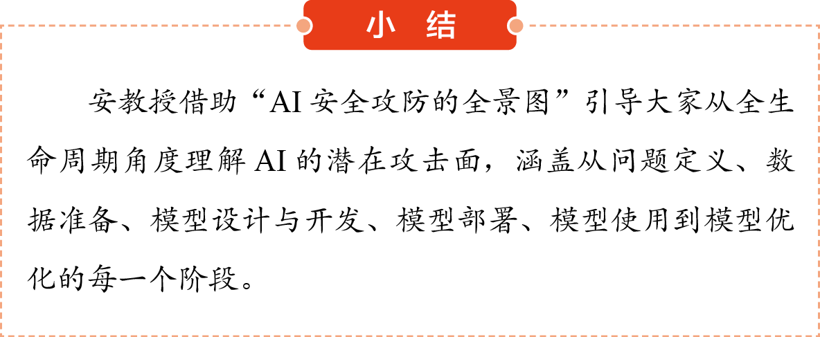 安教授笑着说:“在这学期的课程中,我们可能并不能学完图中所有的知识点,因为随着技术的不断演进,这张图也会不断演化,新的攻击方式、新的防御机制层出不穷。但是我们首先要明白整个AI生命周期都是‘攻与防’的角斗场。只有把风险防控嵌进开发、训练、部署、应用里,构建环环相扣的防御链,才能让AI在安全的轨道上跑起来。”