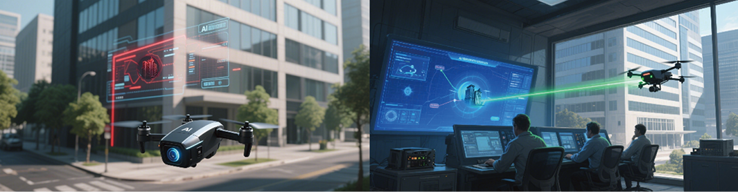 画面中,一架无人机悄然飞近一座大楼,无人机搭载的AI安保漏洞扫描系统实时扫描安保漏洞,迅速生成最优入侵路径。随即,画面切换, AI防御系统捕捉到无人机的异常轨迹,快速识别潜在入侵点,并实时调整防御策略,成功拦截了无人机。