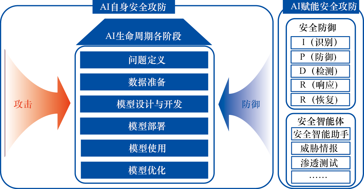 “这是AI安全攻防的全景图。”安教授指着示意图说,“左半部分是AI自身安全攻防,其中左侧箭头代表攻击者,右侧箭头代表防御者,中间部分是AI在其生产和运行生命周期中涉及的关键阶段,每个阶段都可能成为攻击的入口,攻击对象涉及模型、数据和算法各个方面。右半部分是AI赋能安全攻防,包含全流程的安全防御和基于大模型的安全智能体。”