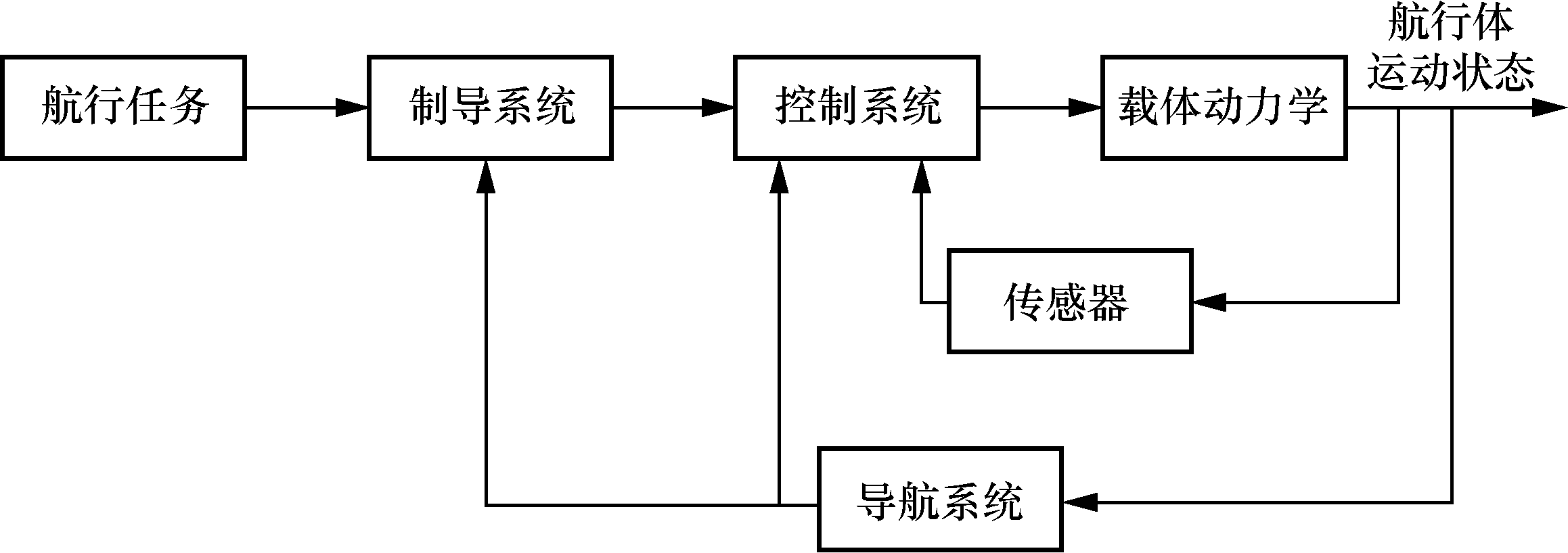 导航是一种技术方法,用于将航行体从起始位置引导至预定的目的地。导航系统的核心职责是为航行体提供即时的位置数据。导航系统一般有两种操作模式,一种是指示模式,另一种是自动导航模式。在指示模式下运行的导航系统,其核心是一种用于测量或显示的系统。工作于自动导航模式的导航系统通过自动控制系统使航行体沿预定轨迹运行,其功能与制导系统的相同。导航系统、制导系统和控制系统之间的关系如图1-1所示。