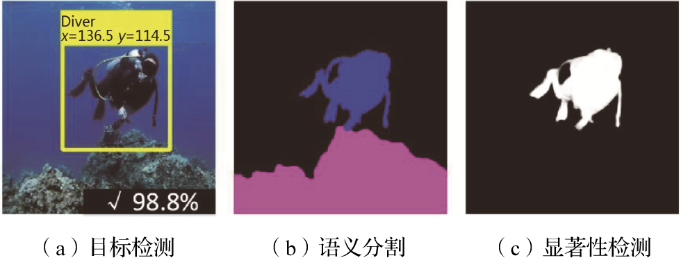 针对水下图像的机器分析在水下环境探测和监测等任务中必不可少,其分析结果可有助于水下机器人的自动巡航、异常处理等操作。下面主要介绍水下目标检测、水下语义分割和水下显著性检测这3类机器视觉任务及其对应的评价指标。