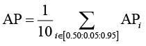 值。COCO数据集使用的IoU阈值区间为[0.50,0.95],以0.05的步长对10个阈值进行采样,计算10个阈值下的AP并取平均值。因此,最终的AP为