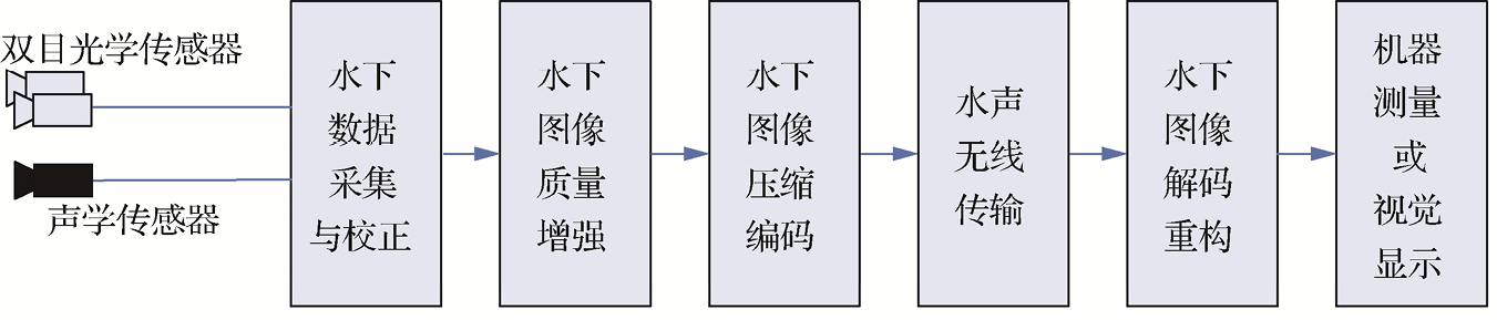 就现有海洋水下成像与压缩传输系统而言,基于多传感器的方式能够获取更加精确的场景信息。图1.2所示为海洋水下成像与压缩传输系统的基本框架,它由水下数据采集与校正、水下图像质量增强、水下图像压缩编码、水声无线传输、水下图像解码重构、机器测量或视觉显示等环节组成。与空气媒介中的无线视频传输与处理系统相比,海洋水下成像与压缩传输系统具有以下主要特点:①水声信道传输速率低、波动大,且传输误码率高;②水下视频不仅服务于人眼视觉,还会面向机器测量和识别;③水下成像条件恶劣,造成水下图像/视频质量、目标细节较差;④多数情况下,水下场景相对稳定、变化小,探测对象的形状可计算。