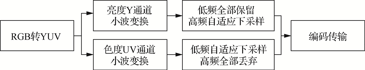 He等人对亮度Y通道进行了四级小波分解,对色度UV通道进行了三级小波分解,其中每一级小波分解可得到4个分量(低频分量LL和高频分量LH、HL、HH),下一级分解则对低频分量LL再次分解,例如LL3代表第三级分解得到的低频分量,其数据量只有原始图像的1/64。由于人眼对色度较不敏感,色度UV通道经三级小波分解后只对低频分量LL3进行保留,高频分量全部被丢弃,其低频分量数据经4倍下采样后进行编码传输。而对于Y通道,其低频分量LL4数据被完全保留,每一级高频分量则根据其对重建图像峰值信噪比(Peak Signal-to-noise Ratio,PSNR)的贡献进行有选择的保留。其中,第一级高频分量由于数据量较大,且对PSNR影响不大,对其全部丢弃;第二、三、四级高频分量计算每一个分量被丢弃后最终重建图像PSNR的变化,作为该分量对PSNR的贡献。其中每一级贡献最大的一个分量被保留,另外两个分量被丢弃,保留分量的数据经两倍下采样后进行编码传输[27]。