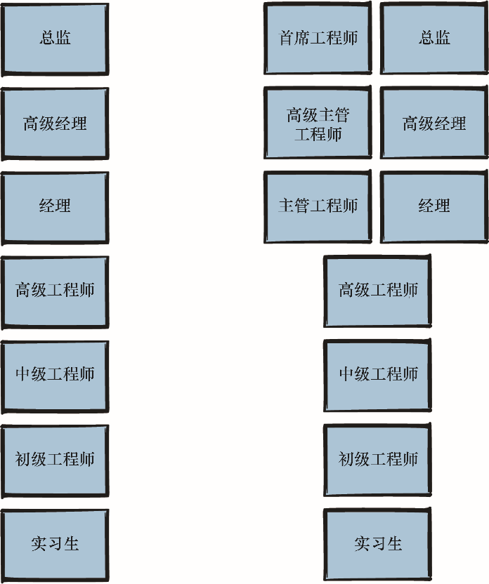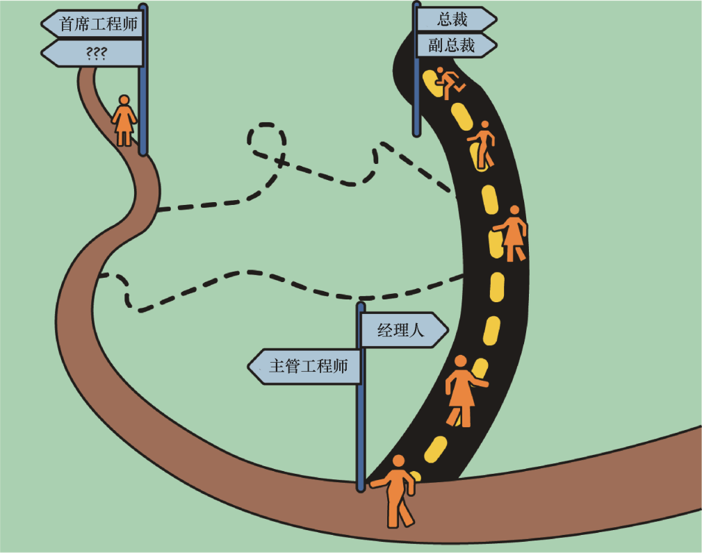 主管工程师的道路则不那么清晰。虽然现在许多公司允许工程师在不带人的情况下不断提升职级,但这种“技术路线”仍然很混乱,没有明确的指引。考虑走这条路的工程师可能从来没有和主管工程师一起工作过,或者只见过少数几种类型的主管工程师,以至于这一岗位看起来像是难以企及的神秘领域(其实不然,这些都是可以学习的)。不同公司对这一岗位的期望不同,即使在一家公司内部,雇用或提拔主管工程师的标准也可能是模糊的,并且缺乏可操作性。
