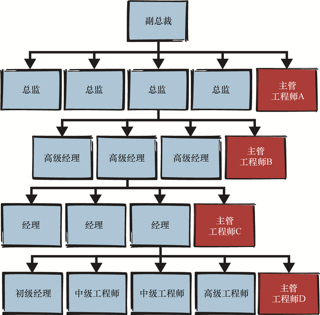 图1-3 处于组织结构不同层级的主管工程师的汇报链。即使这些主管工程师的资历都是一样的,主管工程师A也会发现自己比主管工程师D更容易了解组织背景,也更容易进行总监级别的对话