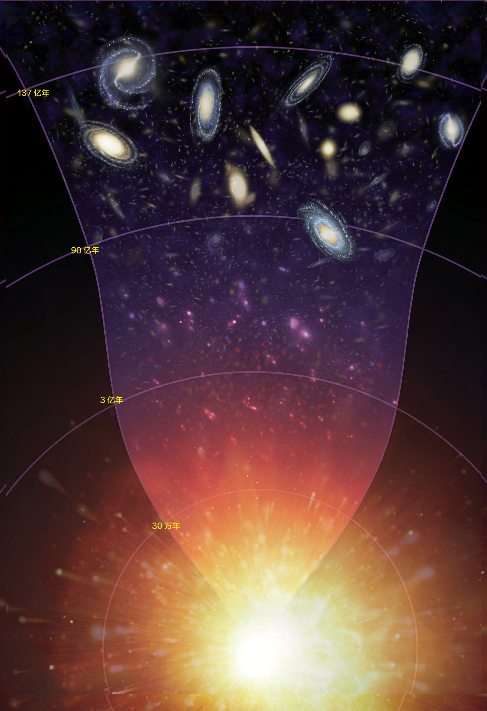 在200亿~100亿年前,在原本没有物质也没有时空的虚无缥缈之中,发生了一次大爆炸,物质和时空就在这大爆炸和随之而来的剧烈膨胀中产生。随着膨胀速度的减慢,最先从虚无中诞生的夸克、轻子和光子的温度逐渐下降,慢慢形成原子、分子,并凝聚成星体、星系、尘埃和气体。物质在万有引力的作用下凝聚坍缩,使大量引力势能转化成热能,大大提高了新形成星体的温度,并引发了大星体的热核反应,使之成为发光发热的恒星,其中就包括我们的太阳。