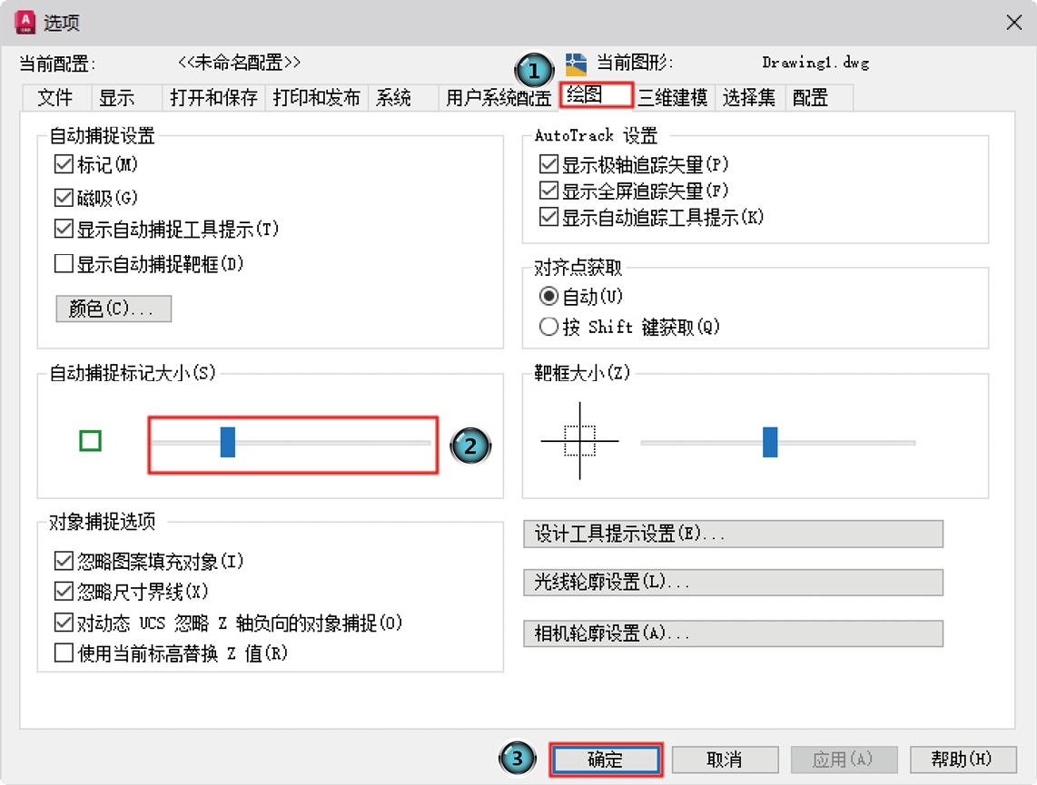 选择菜单栏中的“工具”→“选项”命令,或在工作区域右击,在弹出的快捷菜单中选择“选项”命令,打开“选项”对话框。选择该对话框中的“绘图”选项卡,在“自动捕捉标记大小”中拖动滑块到合适的位置,单击“确定”按钮,即可改变自动捕捉标记的大小。