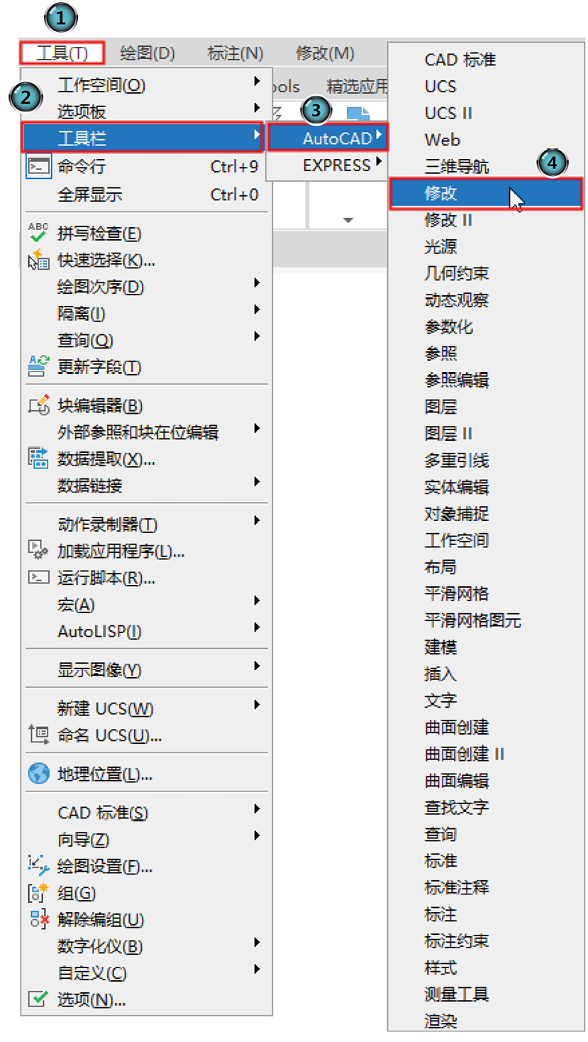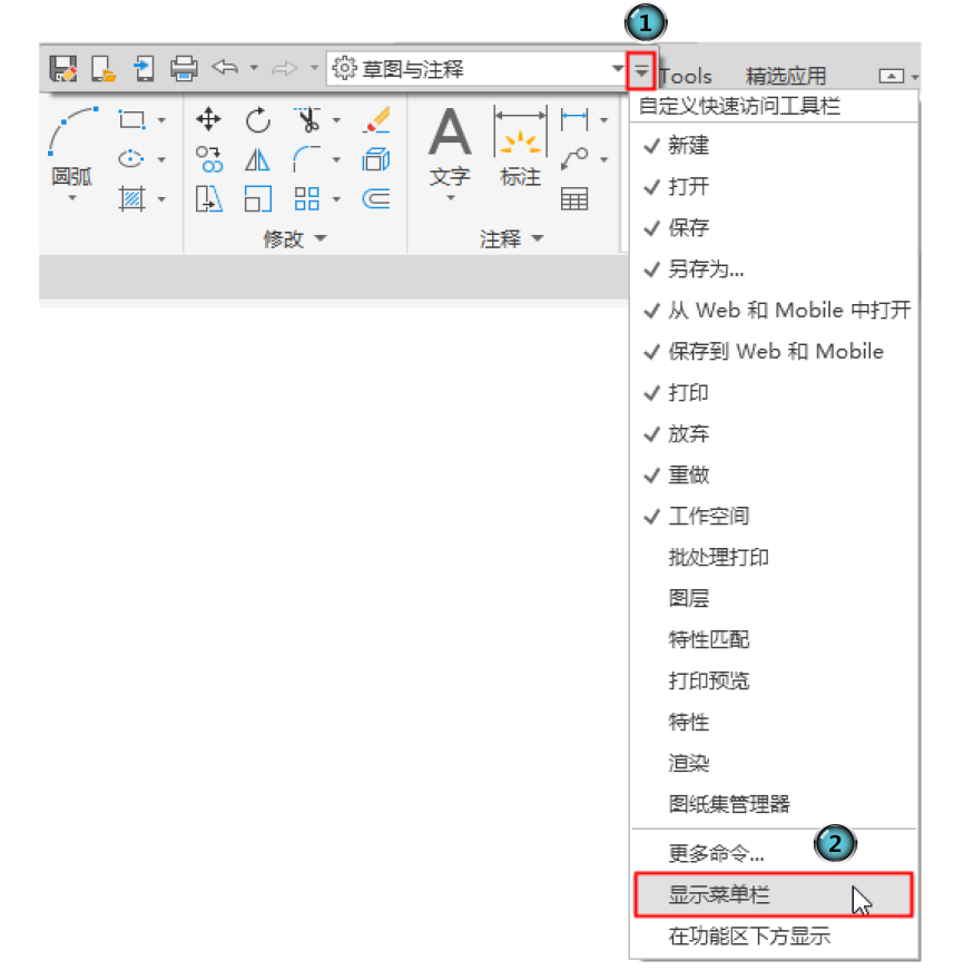 1 显示菜单栏。打开AutoCAD,单击AutoCAD快速访问工具栏右侧的下三角按钮,在打开的下拉菜单中选择“显示菜单栏”选项。该操作调出的菜单栏位于窗口的上方。
