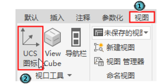 单击“视图”选项卡“视口”面板中的“UCS图标”按钮