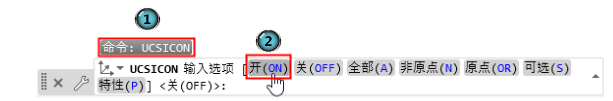 在绘图区底部的命令输入框中输入“UCSICON”命令,按回车键,然后单击“开(ON)”选项,坐标系将显示在绘图界面的左下角。