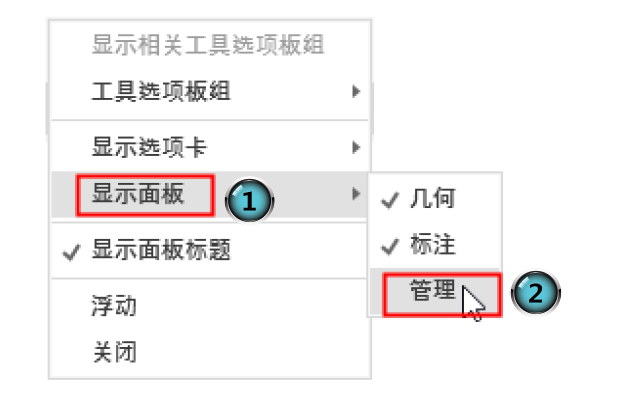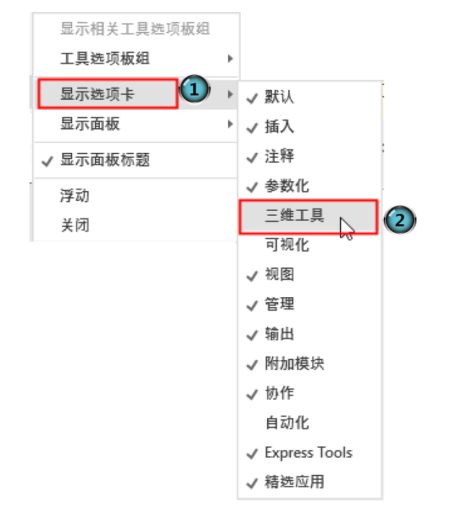 1 在面板中任意位置右击,在打开的快捷菜单中选择“显示选项卡”命令,单击某一个未在功能区显示的选项卡名,系统自动在功能区打开该选项卡。
