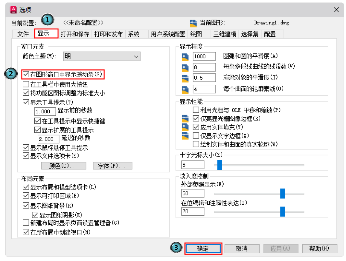 选择菜单栏中的“工具”→“选项”命令,或在工作区域右击,在弹出的快捷菜单中选择“选项”命令。系统将打开“选项”对话框,切换到“显示”选项卡,并勾选“在图形窗口中显示滚动条”复选框,单击“确定”按钮,滚动条将显示在图形窗口右侧。