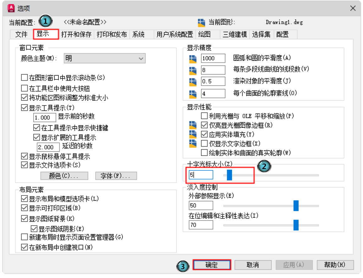 选择菜单栏中的“工具”→“选项”命令,或在工作区域右击,在弹出的快捷菜单中选择“选项”命令,打开“选项”对话框,并切换到“显示”选项卡,在“十字光标大小”的输入框中输入值或拖动右侧滑块到合适位置,单击“确定”按钮。
