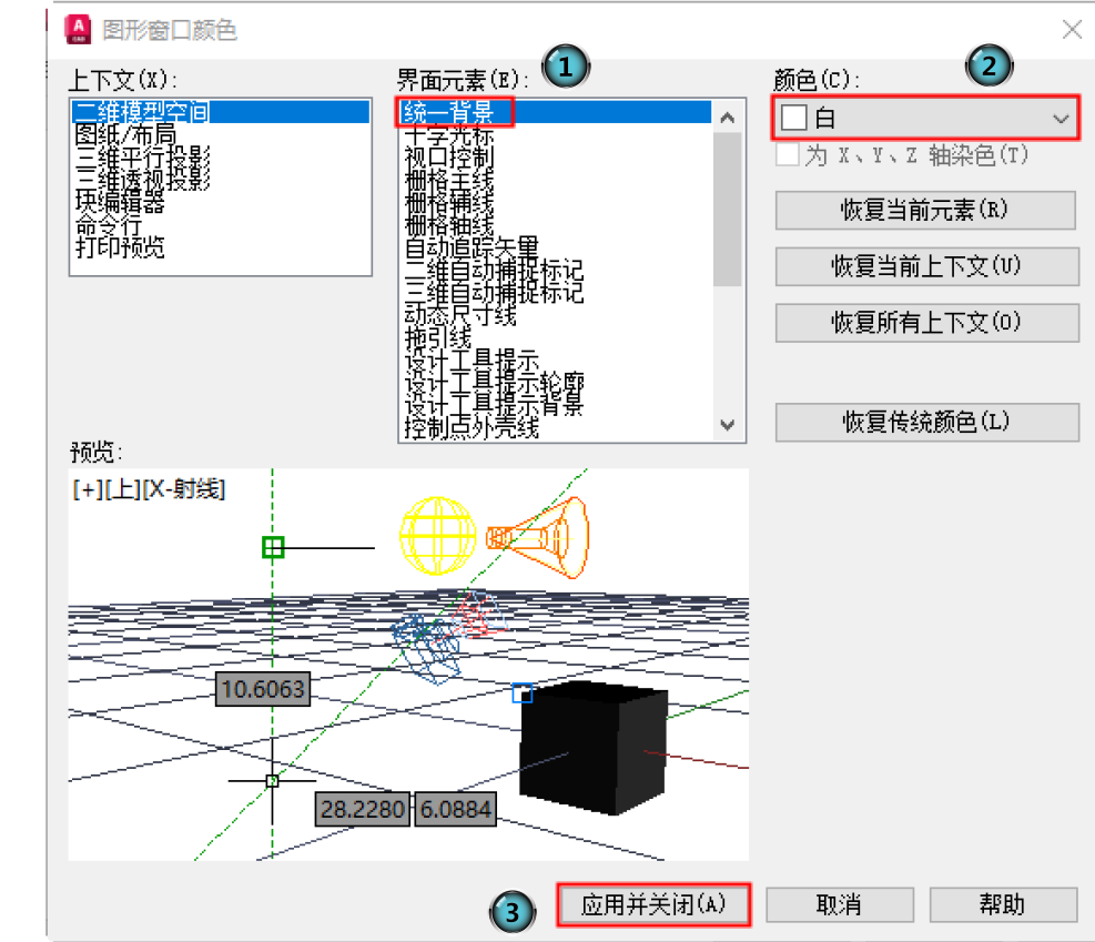 2 在“图形窗口颜色”对话框的“界面元素”中选择“统一背景”元素,然后在“颜色”下拉列表框中选择需要的窗口颜色,最后单击“应用并关闭”按钮。此时,AutoCAD的绘图区就变换了背景色,通常按视觉习惯选择白色为窗口颜色。
