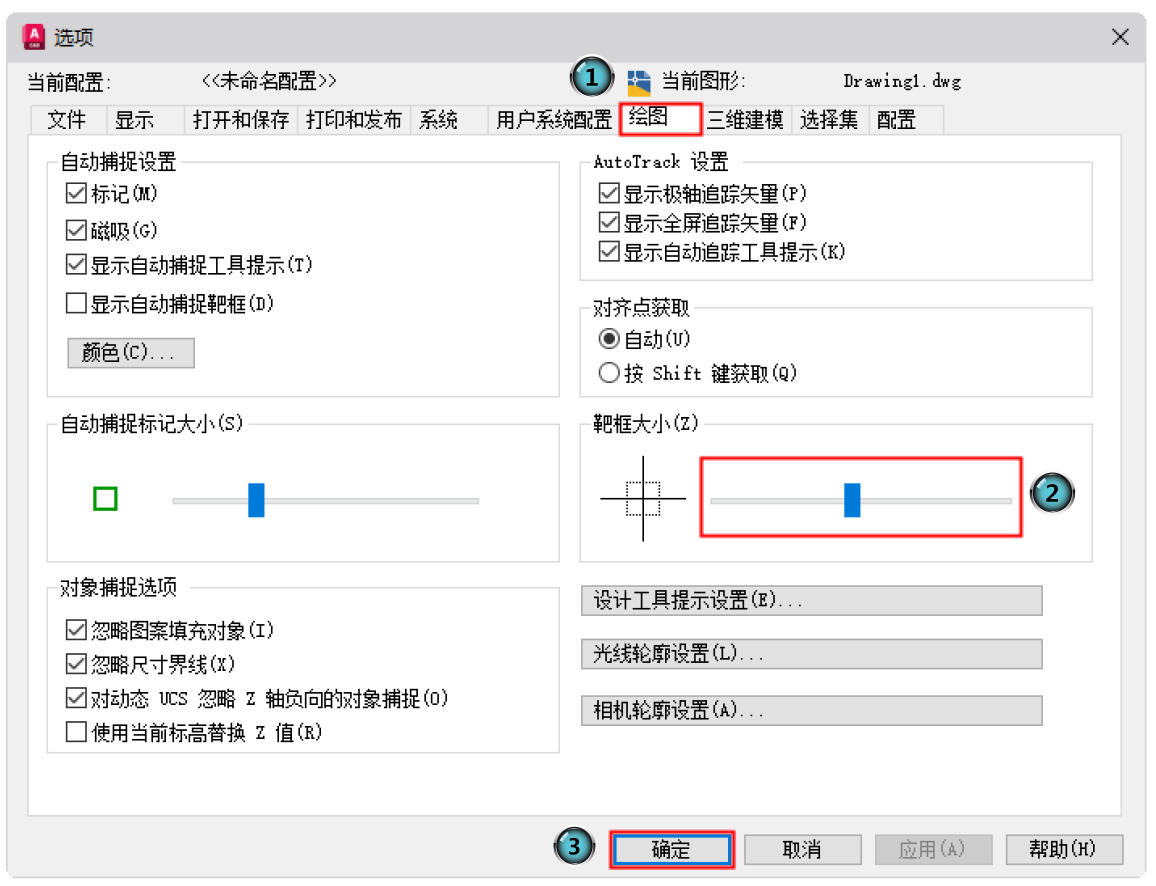 选择菜单栏中的“工具”→“选项”命令,或在工作区域右击,在弹出的快捷菜单中选择“选项”命令,打开“选项”对话框。选择“选项”对话框中的“绘图”选项卡,在“靶框大小”中拖动滑块到合适的位置,单击“确定”按钮,即可改变拾取框的大小。