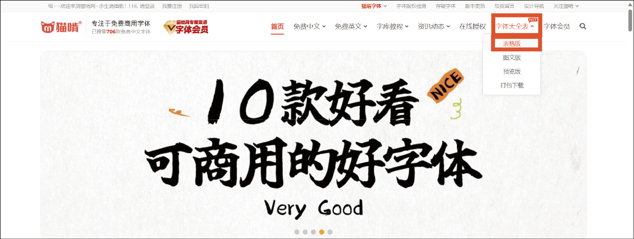 1 在百度网中搜索“猫啃网”,打开网站首页后,选择网页右上角的【字体大全表】-【表格版】命令,就会打开【中国大陆免费字体】页面。