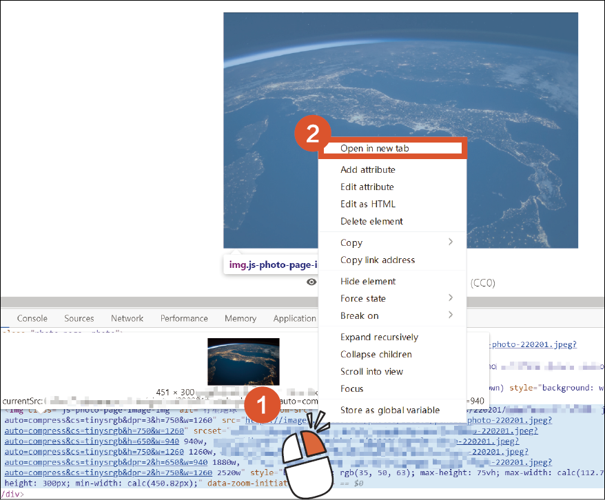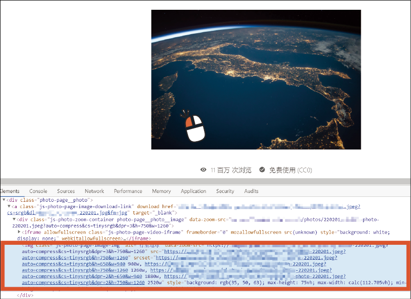 3 单击图片区域,可以在开发调试工具面板中看到一段图片对应的突出显示的代码。
