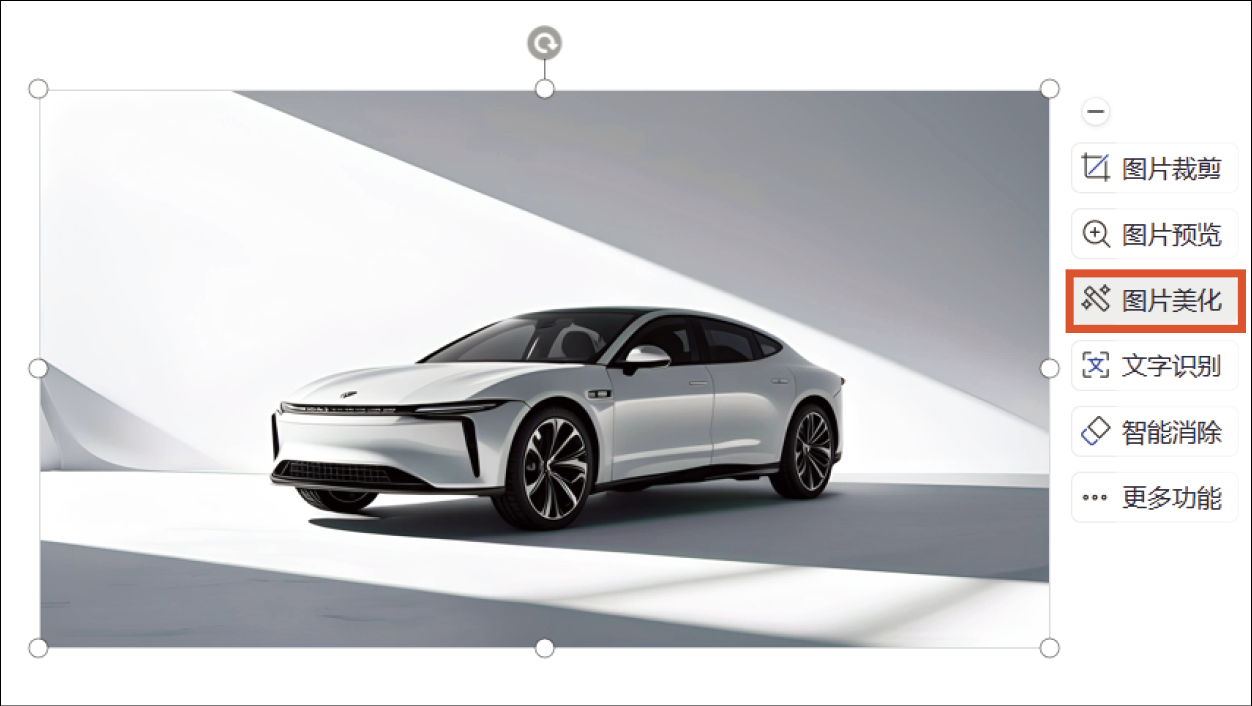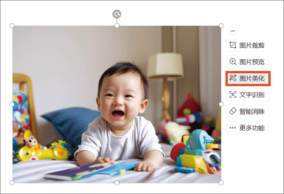 1 插入图片后,选中目标图片,在图片右侧单击【图片美化】按钮。