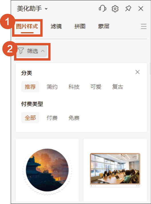 2 在弹出的【美化助手】面板中单击【图片样式】选项卡,可以看到有很多不同的图片样式供选择,单击【筛选】按钮,根据需求选择【分类】和【付费类型】。