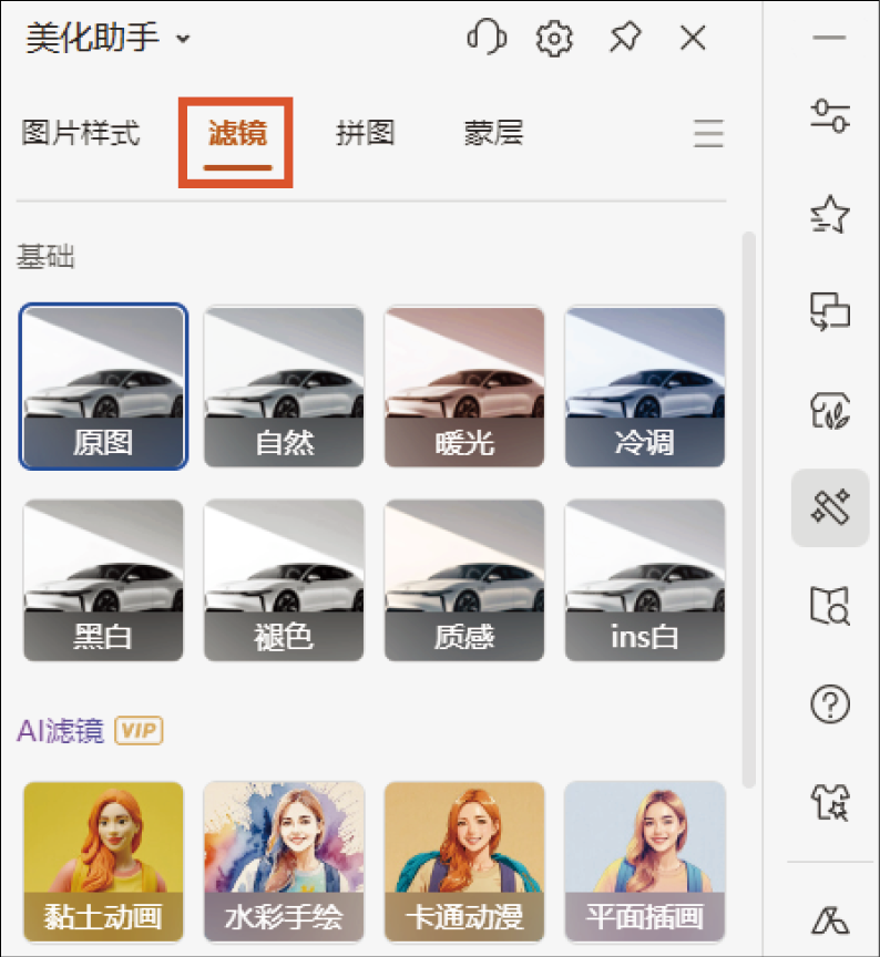 2 在弹出的【美化助手】面板中单击【滤镜】选项卡,除了基础滤镜,还包含最新的AI滤镜(支持风格转换),以及人像、风景、文本、美食等滤镜。