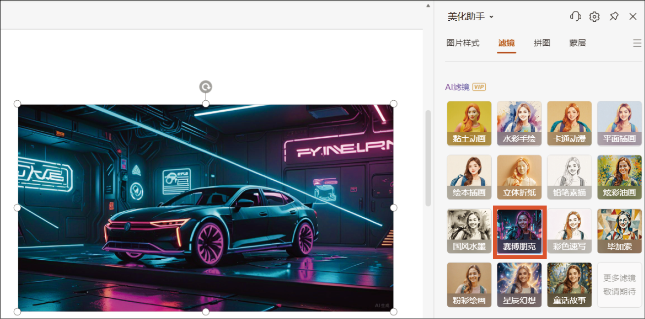 3 挑选喜欢的滤镜样式,单击对应的滤镜图标,例如“赛博朋克”,即可一键为图片添加滤镜效果。