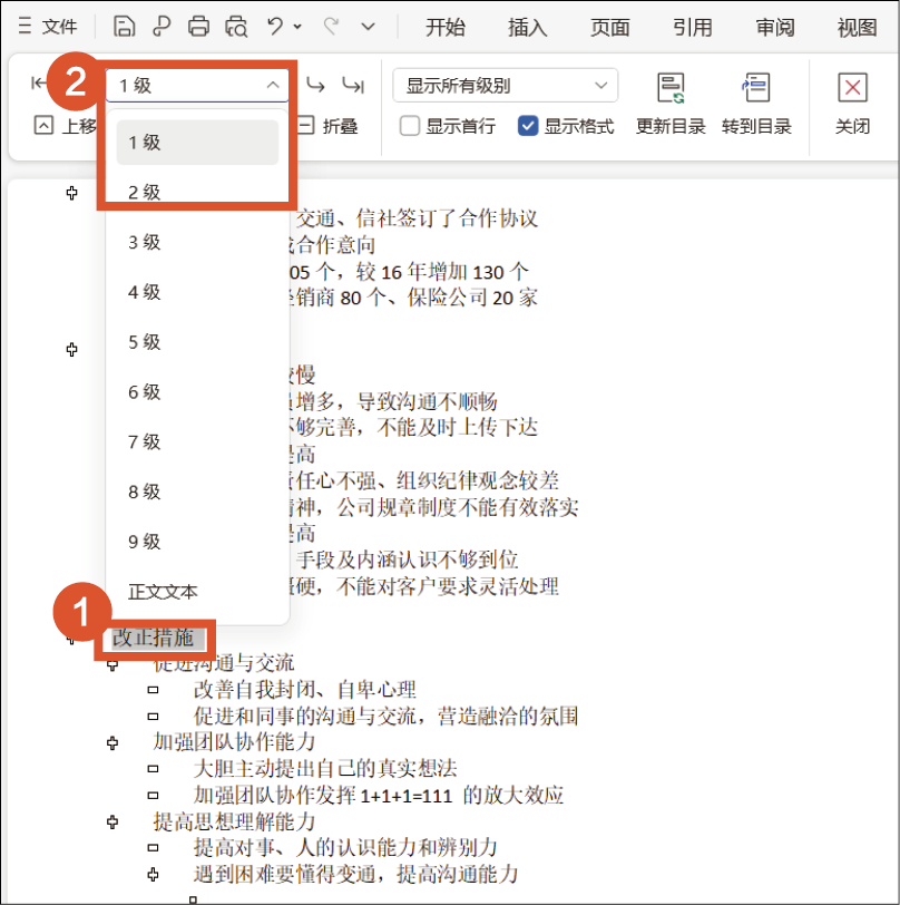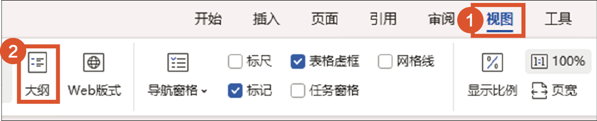 1 在WPS文字中选择【视图】-【大纲】命令,进入大纲编辑模式。