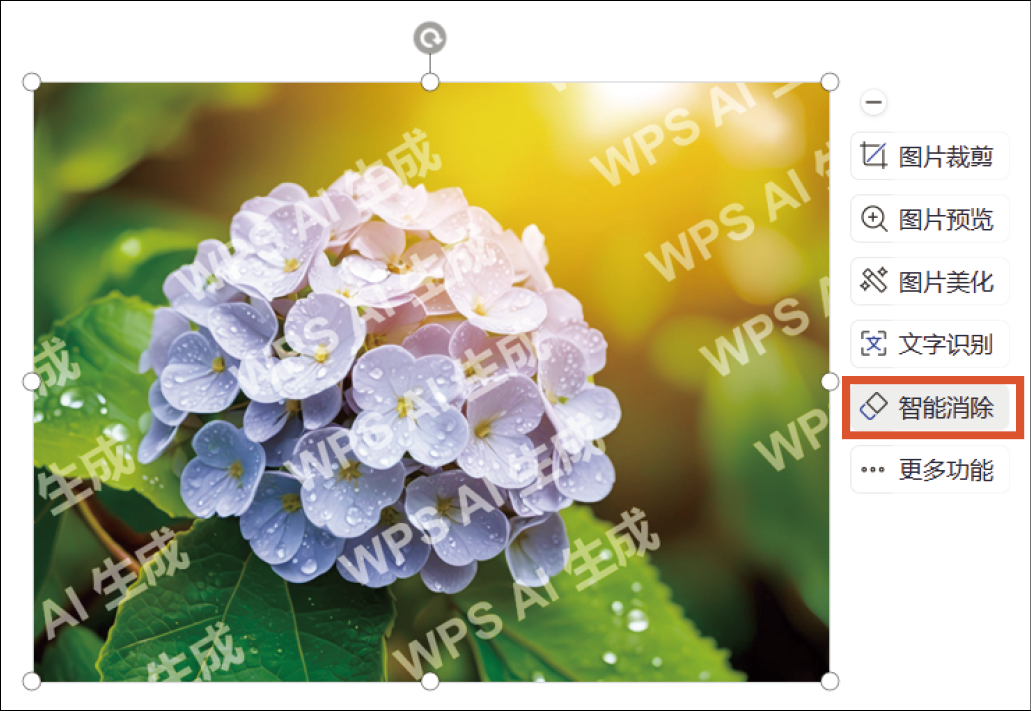 1 插入带水印的图片后,选中图片,在图片右侧单击【智能消除】按钮。