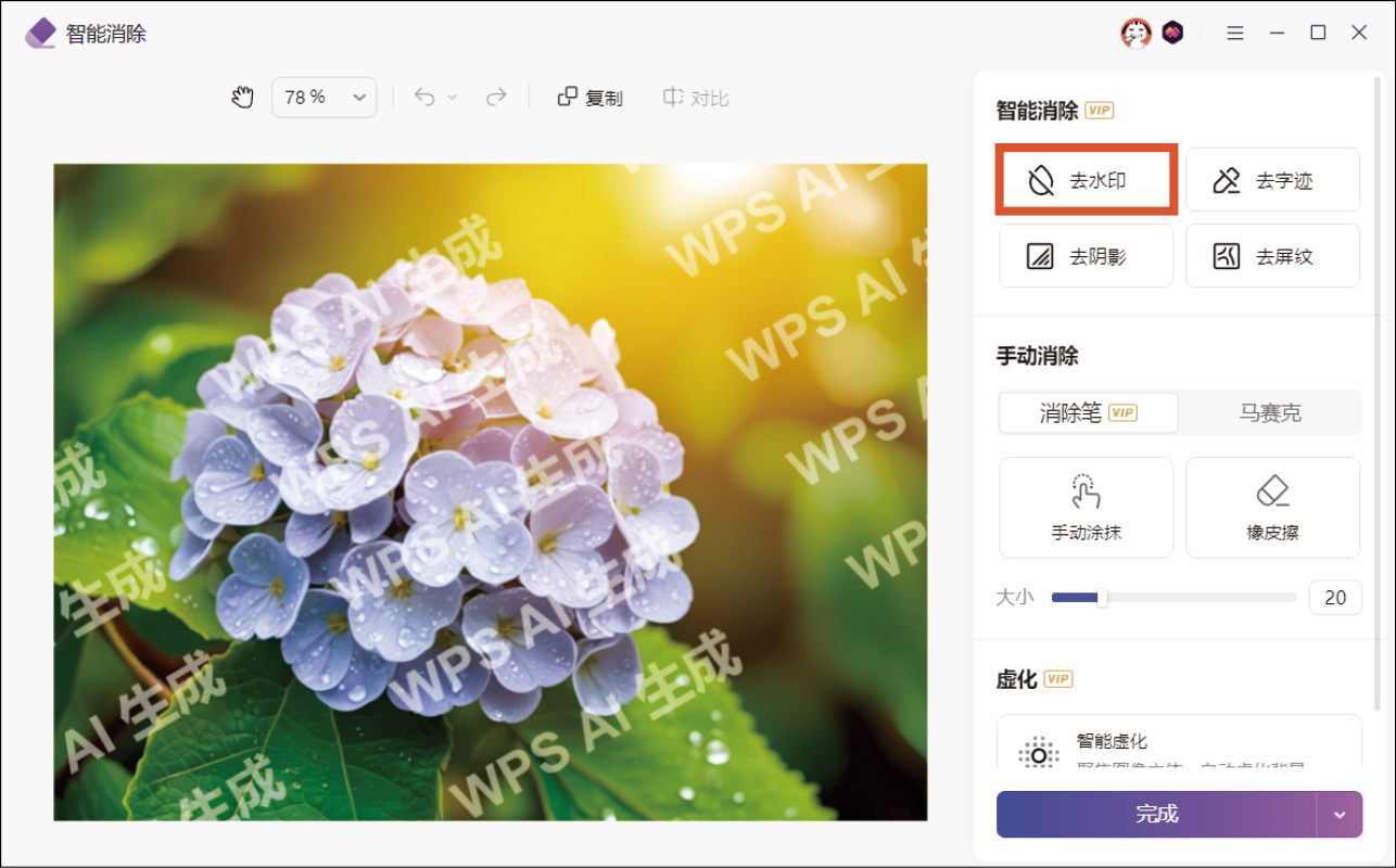 2 单击【智能消除】窗口中的【去水印】按钮,WPS AI会自动识别水印并消除。