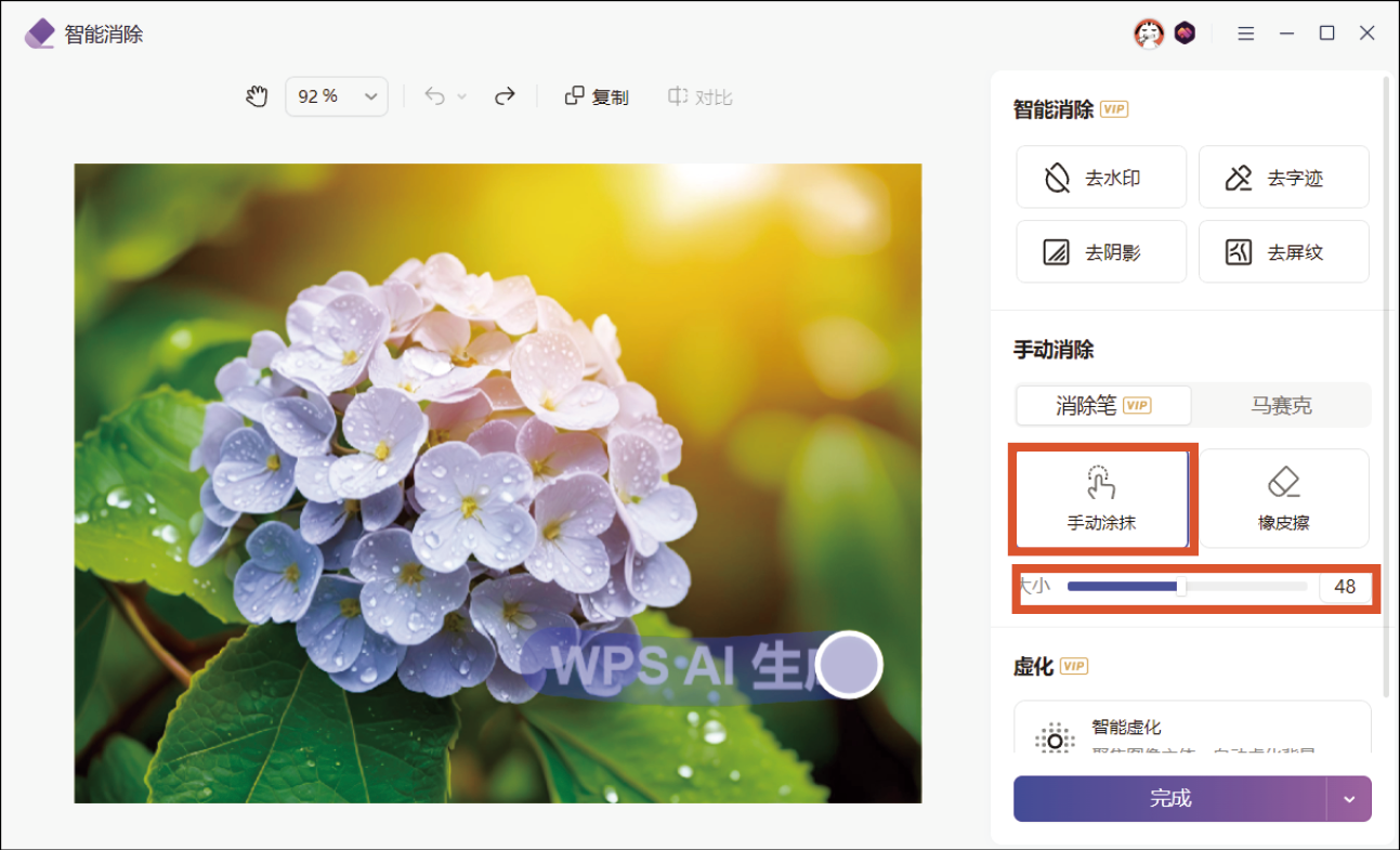 3 如果自动识别失败,还可以单击【手动涂抹】按钮,拖动滑块调整画笔大小,涂抹覆盖水印区域(支持多次涂抹复杂水印),WPS AI自动分析并生成修复方案。