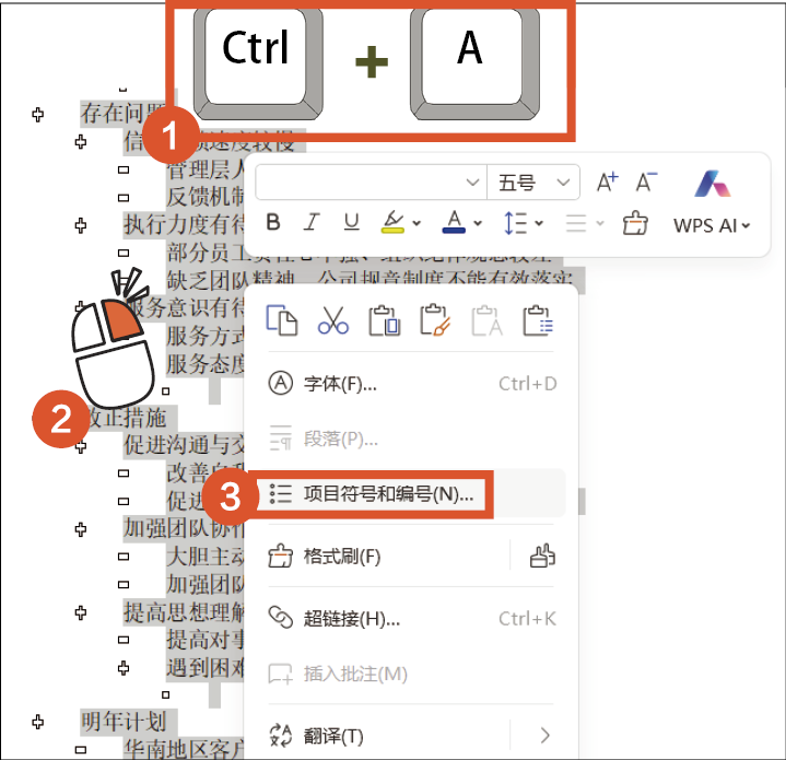 3 按快捷组合键【Ctrl+A】全选文字,单击鼠标右键,在弹出的菜单中选择【项目符号和编号】命令。