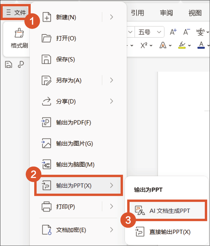 5 选择【文件】-【输出为PPT】-【AI文档生成PPT】命令。