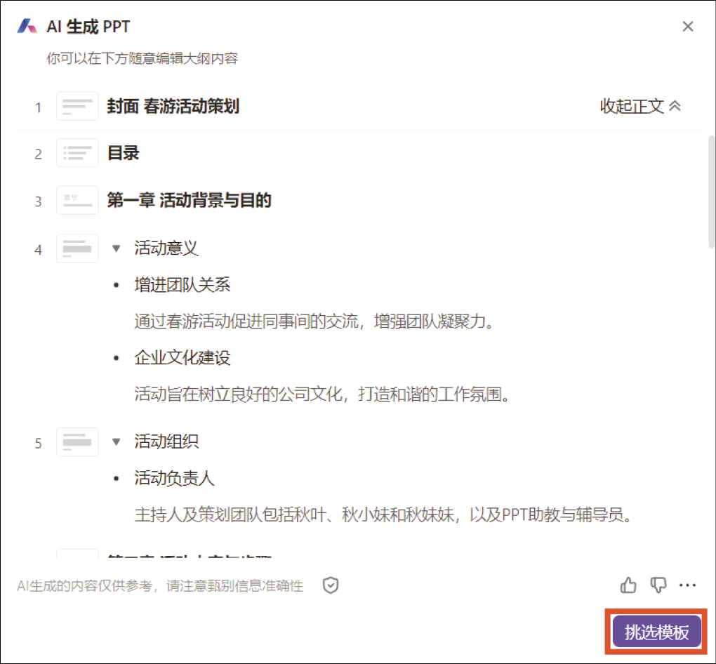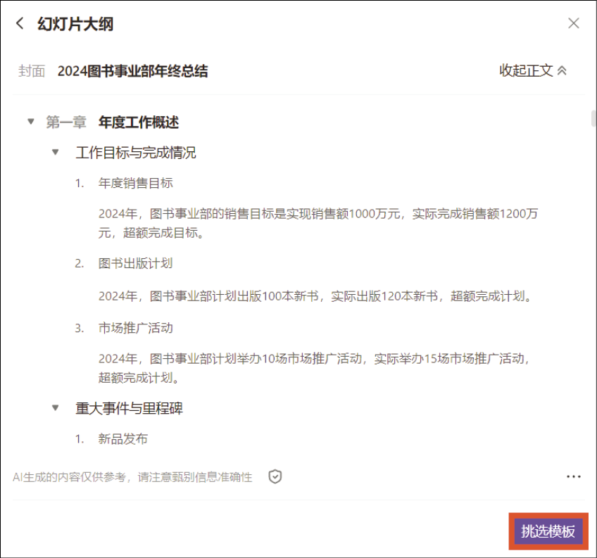 6 AI会自动梳理大纲和正文内容,确认无误后,单击【挑选模板】按钮。
