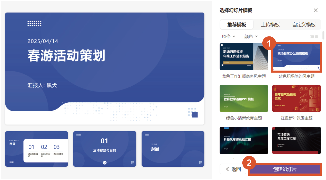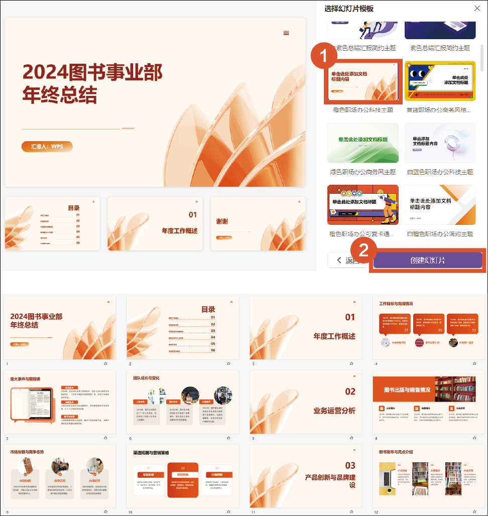 4 在弹出的对话框中选择合适的模板,单击【创建幻灯片】按钮,就会自动生成一份演示文稿。