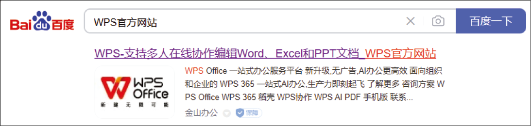 1 在百度网中搜索并打开名为“WPS官方网站”的网站。