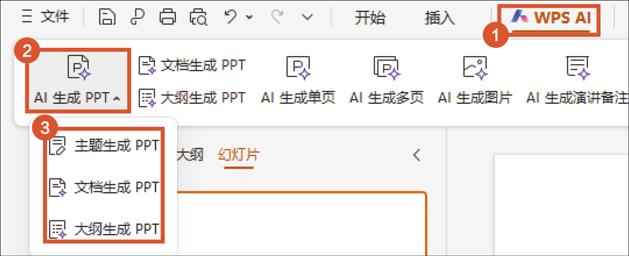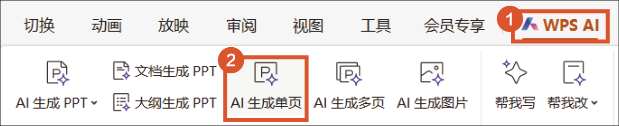 1 新建空白演示文稿,选择【WPS AI】-【AI生成单页】命令。