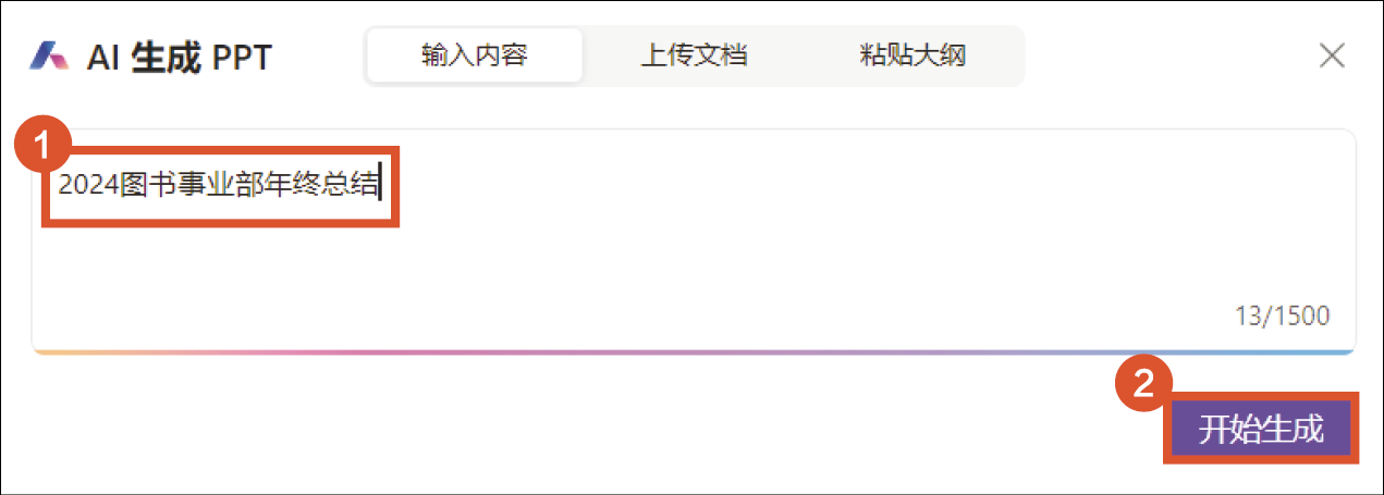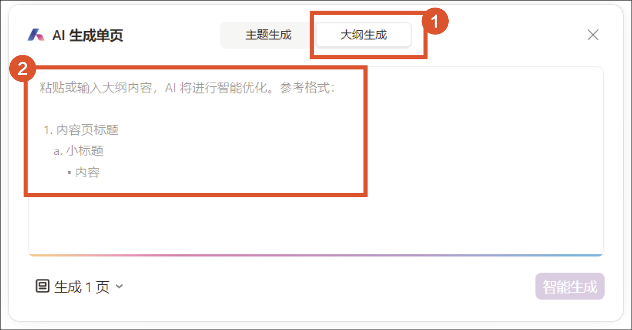 5 如果已经有现成的单页大纲,在输入内容时,还可以选择【大纲生成】模式,WPS AI就能根据大纲生成对应的内容了。