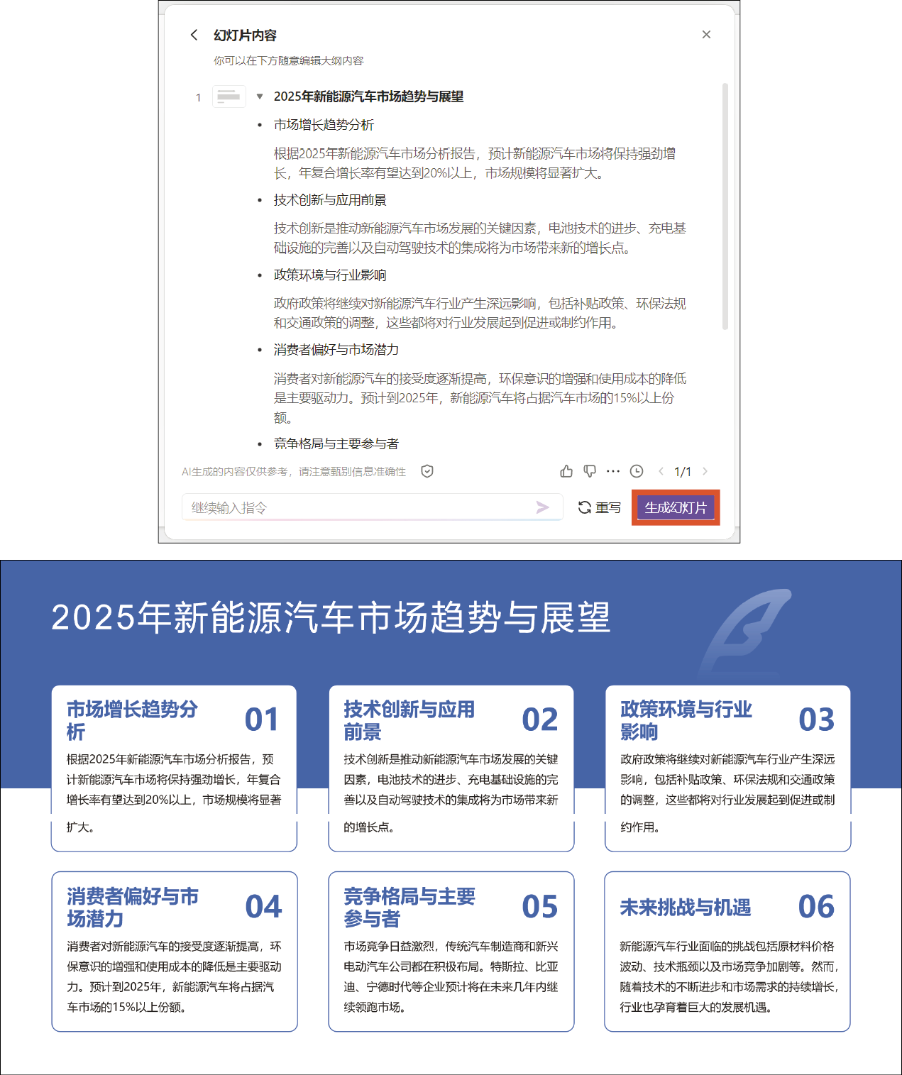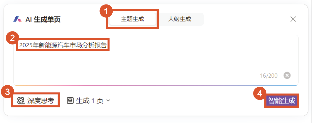 2 在【AI生成单页】面板中选择【主题生成】模式,输入主题(如“2025年新能源汽车市场分析报告”)。若开启【深度思考】功能,则生成的内容质量更高,但耗时更长。单击【智能生成】按钮,WPS AI将自动生成文字内容。