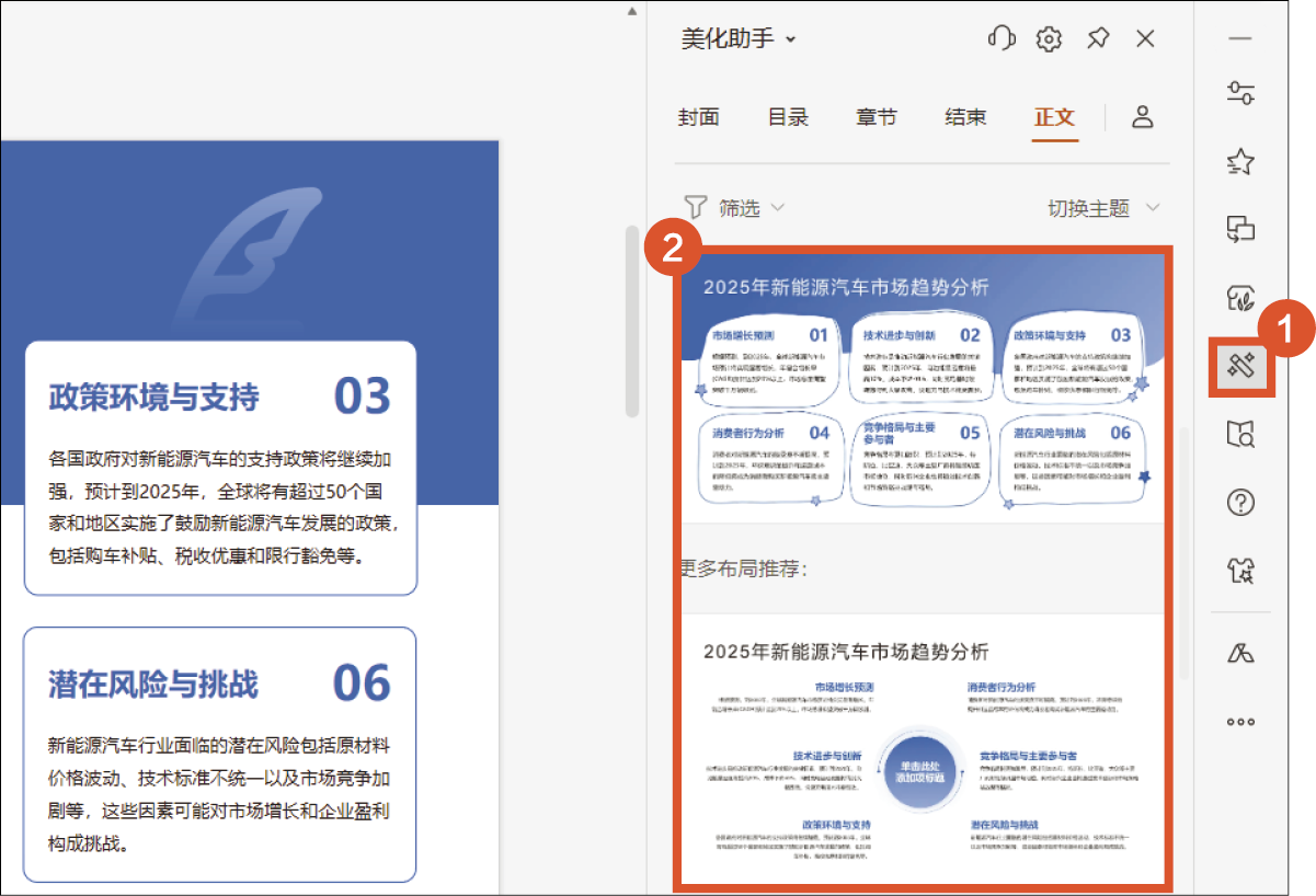 4 如果对版式不满意,还可以单击界面右侧的【美化助手】按钮,挑选合适的模板,WPS AI将针对内容自动适配版式,完成单页设计。