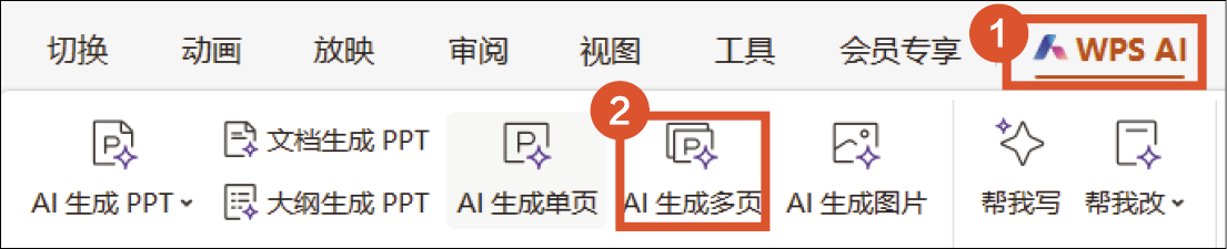 1 新建空白演示文稿,选择【WPS AI】-【AI生成多页】命令。